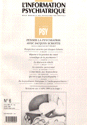 L'Information psychiatrique N°6, vol75, Juin 1999, pp.559-674 "Jacques Schotte occupe une position importante de psychiatre et de psychanalyste dans la psychiatrie contemporaine. Mais c'est surtout comme penseur de la psychiatrie d'aujourd'hui qu'il mérite d'être mieux connu du public français. Sa formation, d'une richesse exceptionnelle, est relatée ici ; elle permet de mieux appréhender les lignes de force qui lui ont permis de constituer une synthèse originale et très féconde de ce qu'il nomme désormais l'« anthropopsychiatrie ». Les rencontres qui ont jalonné son existence sont notamment celles de Szondi, Binswanger, Lacan, Tosquelles, Maldiney, Kuhn, qu'il considère comme ses maîtres en psychiatrie." (Résumé intervention P. Delion) Jacques Schotte, esprit d'une grande richesse, nous a fait le plaisir et l'honneur de venir assister au Colloque de Perpignan en 1997, sur "L'Actualité de l'Oeuvre d' Henri Ey", s'entretenant avec nous de ses maîtres dont le Pr Vergotte, et des peintres du groupe COBRA dont K. Appel et Jorn... (PB) |